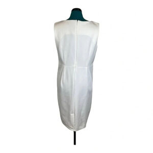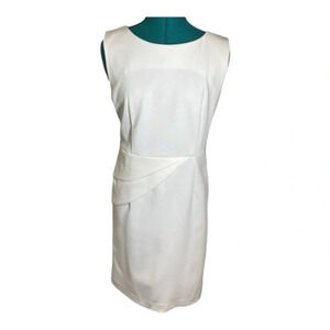 Elegant Premise Studio “Polly” cady sheath dress in pearl ivory with chic side pleating for a flattering silhouette. Features a sleeveless design, hidden back zipper, and a polished finish perfect for work, events, or special occasions. New with tags, original retail $128.