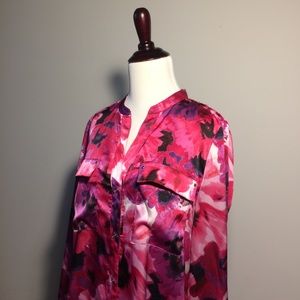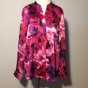 Beautiful shirt poly spandex, colorful magenta, purple, pink, white and black. Font pockets and roll up sleeves. Loose and comfortable fit.