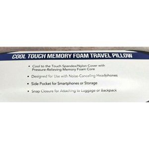 Experience ultimate comfort with our American Tourister Cool Touch Memory Foam Travel Pillow. This travel pillow features a convenient side pocket for smartphones or extra storage, along with a secure snap closure for easy attachment to luggage or backpacks. Specifically designed for use with noise-canceling headphones, it ensures a tranquil journey. Enjoy the cool-to-the-touch feel for a refreshing travel experience. Your perfect travel companion for comfort on the go!