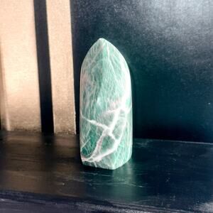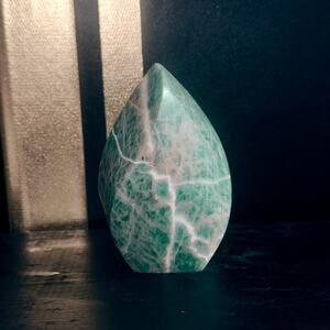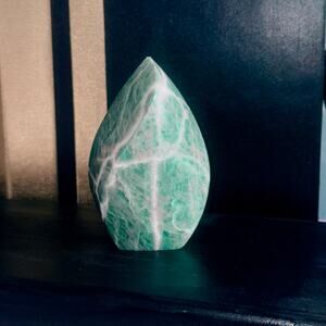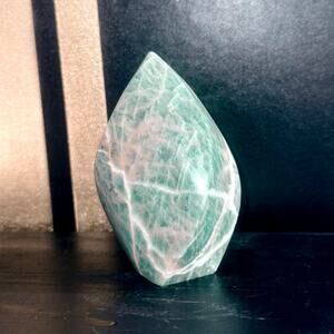 Elevate your home or office with this stunning Amazonite flame, hand-polished from premier Brazilian material. At 368 grams and standing 4″ tall (base approx. 2¾″ wide), its gentle sea-foam green and white veins bring tranquil beauty and harmonious energy to any space. Amazonite is celebrated for its soothing vibrations, supporting truth-speaking, emotional balance, and stress relief—perfect for meditation corners, nightstands, or mantel displays.