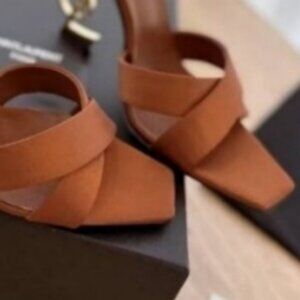 Invest in premium style with these brown YSL heeled sandals, adorned with the prominent YSL logo seamlessly integrated into the heel structure.