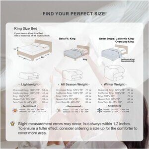 🧿All-Season Weight for Year-Round --- Not too hot, not too cold, offers a just-right feel that suits the average sleeper, ideal comfort that lasts year-round. It’s our most versatile, popular pick. Available in 5 options: Oversized King size 120" x 98", California King size 108" x 98", King size 106" x 90", Queen size 90" x 90", and Twin size 68" x 90". To ensure a fuller effect, consider ordering a size up for the comforter to cover more area