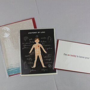 -Anatomy of Love card. Cover has a body with different words like patience, faith, etc pointing to different body parts. Matching envelope with blank interior. New in Plastic.