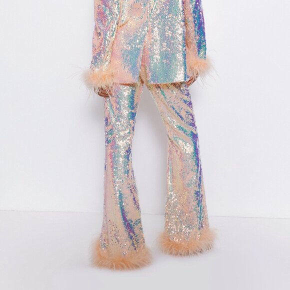 Add some sparkle. Feel fierce in our flare pants, made in high quality sequin fabric with a iridescent colorway, and a fun feather trim.