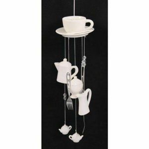 Whimsical! Premium Teacup Teapot White Ceramic Wind Chimes. Glass teacup ornaments and metal chimes shaped like forks and spoons create a uniquely eye-catching style that works with modern and contemporary decor. Crystal-cut bead accents along the strings catch and reflect sunlight for an added decorative touch. Overall Height - Top to Bottom: -24". Width - Side to Side: -5". Overall Depth - Front to Back: -5". Overall Product Weight: -2 lbs. NIB. All measurements are approximate. J0510