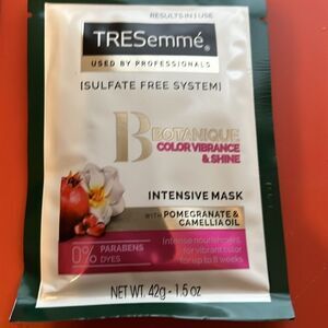 1- Tresemme sulfate free system Botanique Color Vibrance and shine intensive mask with pomegranate and Camilla oil. Intense nourishment for vibrant color for up to eight weeks. Zero parabens or dyes.