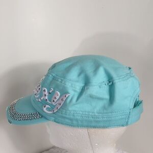 This turquoise colored Premium "Sexy" studded distressed woman's cap is a one size fits most with an adjustable velcro strap in back for that perfect fit. 100% cotton. Pre-owned and in great condition. All offers welcome.