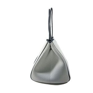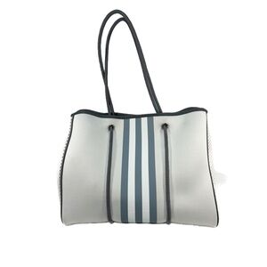 Neoprene tote has gusseted snap side closure, sailing rope handles that fit easily o er the shoulder. This bags main color is Stone, with slate bluish gray and white stripes. Inside are two roomy zippered pockets, ont on each side, magnetic center snap closure at top of bag for easy access.