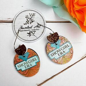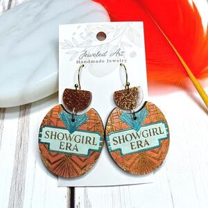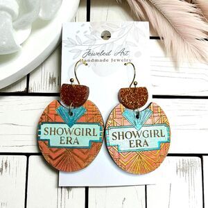 Step into the glam with these handcrafted wood earrings, painted in soft blush tones and accented with sparkling copper glitter. The bold “Showgirl Era” design celebrates confidence, artistry, and a touch of vintage cabaret charm. Lightweight yet statement-making, they’re perfect for anyone embracing their fearless era.