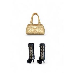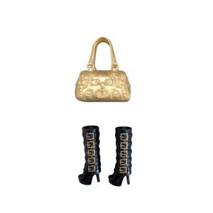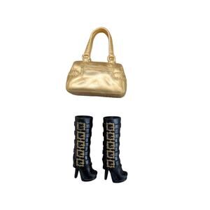 Pre-owned Barbie Doll Accessories Black Gold Platform High Heel Shoes & Handbag