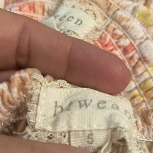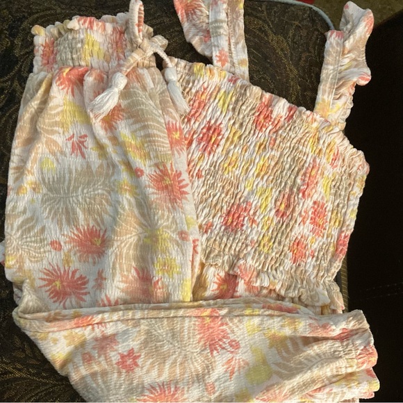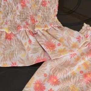 Pre-owned Btween size 5 girls, two piece pants outfit, includes sleeveless ruffled tank style top with smocked bodice, and peplum. Pants are harem style with tasseled bowl on elasticized waistband. This outfit features a peach, tan and cream tropical print.