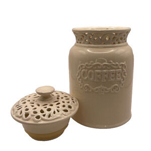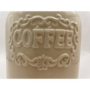 This beautiful ceramic coffee jar from California Pantry is perfect for storing your favorite coffee beans or grounds. The hermetic seal keeps your coffee fresh for a longer period of time. The jar is a cylinder shape with lid and is large coffee jar. The cream color and contemporary style make it a great addition to any kitchen décor. The jar is made of ceramic/porcelain, and measures 6.75 inches in height, 4.25 inches in width and 4.24 inches in depth. The item weighs 1 lb 2 oz and comes with one jar and lid. The coffee jar is in great condition and has not been modified. It is an ideal item for adults who love coffee and want to keep it fresh.