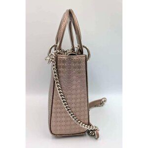 -It features top handles, an optional adjustable shoulder strap and polished silver hardware, including: handle rings, clasps, decorative eyelets, and a hanging letter “Dior" charm.