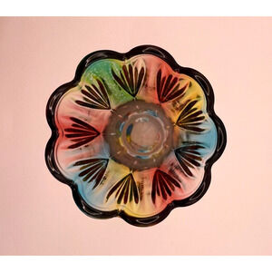 This colorful vase is in great used condition. However, there are small bubbles in the color, please refer to pictures.