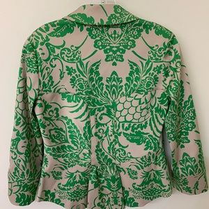 3/4 sleeves, has 3 buttons, Silk blend, beige with green botanical print and solid green lining.