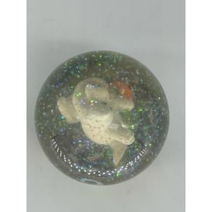 Adorable Greenbrier Industries Small Halloween Glitter Snow Globe. Globe has 2 ghosts and a pumpkin. The outside base is textured and is decorated with 3D ghosts and pumpkins as well. It measures approximately 4 inches high and 2 inches across the base. Hard to find.