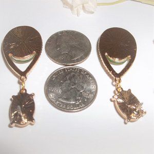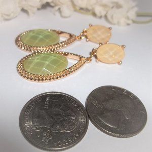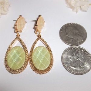 This pre-owned dangle earring set is in good condition. It is gold toned costume jewelry. The top cabachon acrylic faceted stones are a light cream yellow color with flecks of metallic gold in them. The bottom cab is also faceted acrylic and a green with a glittery shimmer to it. They have post stud backs for women's pierced ears. Measure 2 1/8 inches tall and 3/4 inch wide. Each single earring weighs 7.1 grams. Very gorgeous set! Buy it now before someone else does!