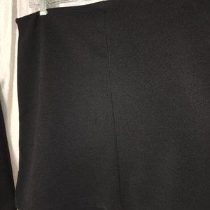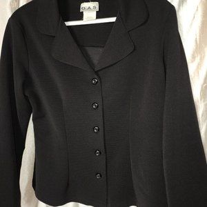 This Pre-owned G.A.S. Great American Sportswear Black Jacket and Mini Skirt Set is in great condition with only very minimal signs of wear on the right sleeve cuff - not noticeable - see pictures for exact lovely condition. Fitted black jacket is unlined poly spandex for a flattering fit. Bodycon bun hugger skirt has hidden elastic waist for a sleek look. Comfortable and easy to wear, wrinkle resistant, machine washable very cute little black suit. These items have been washed and dried prior to taking pictures & measurements. Measurements are approximate, taken with garments lying flat & doubled as necessary.