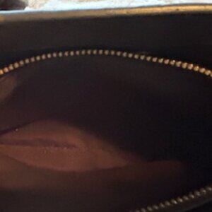 This purse is brown leather with a canvas leopard print. It also has a gold metal horse and buggy emblem attached to the purse. There are no tears or stains. I do not smoke or carry perfume in my purse, so no weird smells. There is a large zippered pocket in the middle of the purse, another zippered pocket on one side and two slots on the other side, which is where I always carried my phone. Both sides snap to the center portion. There is a pocket in the back of the purse, which does not have a closure. Has hand straps and a removeable crossbody strap.