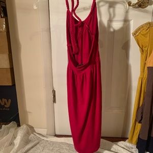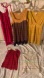 Included is a variety of summer casual dresses with a lightweight jersey feel with some stretch. There are 3 dresses, including one magenta halter dress, one color block style dress with scoop neck (there are small loops on the side of this dress, so it must have had a belt with it originally) and one V-neck mustard color dress. Also included is a plain camisole and a strapless little tank top.