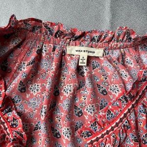 Pre-owned Max Studio Red Floral V-neck Blouson Ruffle Sleeve Summer Top Small