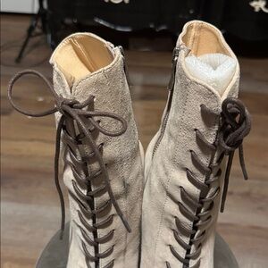 Chic suede lace-up boots with a stylish design. Perfect for versatile wear, wood heels-4 1/2, second set of beige lace for boot included. Normal wear, took pictures of little black spots