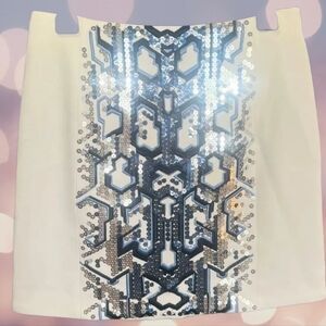 Step into runway history with this stunning Mugler Paris skirt from the Spring/Summer 2018 collection, designed under David Koma. This piece features Mugler’s signature futuristic edge with a bold geometric sequin motif in shimmering navy, silver, and black on crisp white.