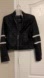 Chic black leather jacket featuring striking contrasting stripes. Perfect for a stylish edge.