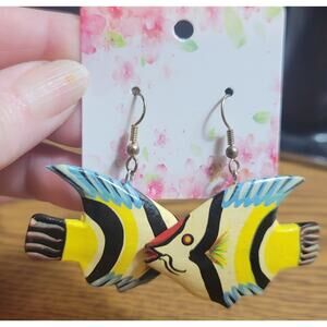 Add a touch of whimsy to your style with these vintage wooden fish dangle earrings! These pre-owned earrings are in good vintage condition and feature a unique fish design. Perfect for adding a fun, nautical touch to any outfit.