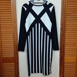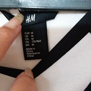 Beautiful black and white midi dress by H&M. Excellent preowned condition. Very clean inside out. Worn few times only. Size Medium but the fabric stretch. Very elegant dress pair with belt to create some curve or just as is. Gorgeous dress for office or casual occasions. Ready to wear. Thanks.