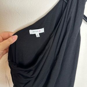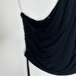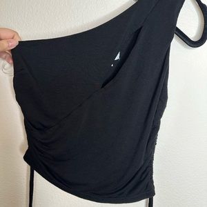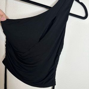 This is a preowned black one shoulder crop top with a slit across the chest also rouge sides, that are adjustable with strings so you can decide how cropped you want it.