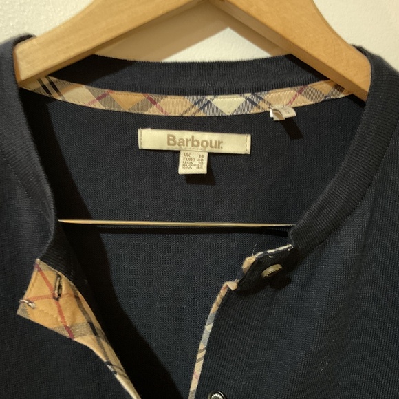 Preppy Barbour women’s classic navy cardigan sweater with tartan trim