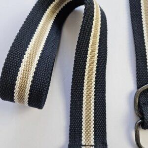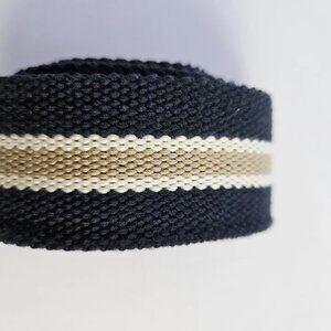 Elevate your casual style with this classic preppy canvas belt, measuring 44 inches long with a versatile D-ring buckle closure. Designed in a timeless navy blue with cream and tan stripes, this belt brings a polished yet laid-back vibe that’s perfect for everyday wear.