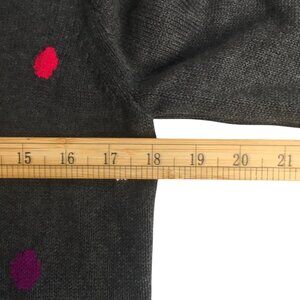 Color: Charcoal gray with red, purple, and white polka dot pattern throughout the sweater
