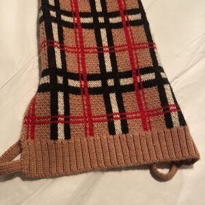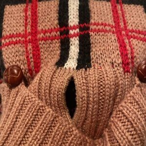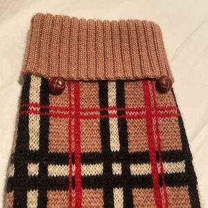 Stylish plaid knit dog sweater. Features a classic pattern with a cozy fit. Perfect for keeping your pet warm. Fits a small dog.