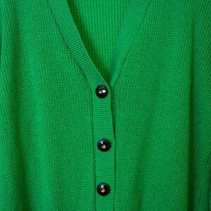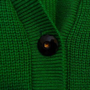 Cozy vintage cardigan with classic collegiate vibes in a striking Kelly green. Features deep navy striping at the hem and sleeves, brown marbled buttons, and a flattering v-neckline. The slightly oversized fit pairs well with academia, preppy, or librarian-inspired looks.