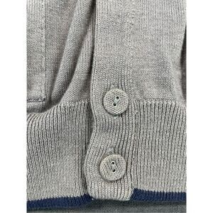 Lightweight gray knit cardigan with varsity-style double stripe on the sleeve and button-up front. Features a soft collegiate aesthetic with a deep V neckline, front patch pockets, and ribbed trim. BDG from Urban Outfitters, size S.