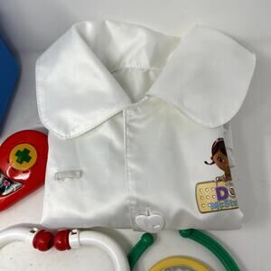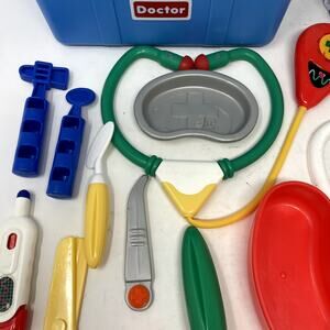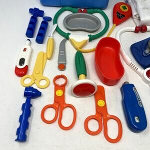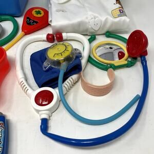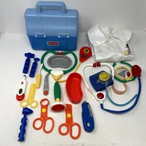 Preschool pretend play doctor's kit, including plastic carry case bag, white coat, and lots of accessories. Everything in pictures is included. Used, played-with condition with marks, wear, dirt, imperfections, etc as shown, please see pictures.