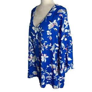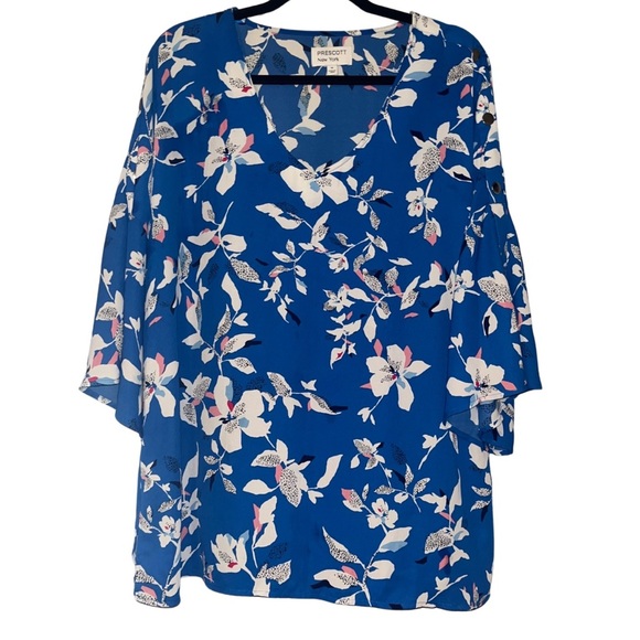 Prescott New York Blue Floral V-Neck Tunic Blouse – Size 14 – Bell Sleeves
