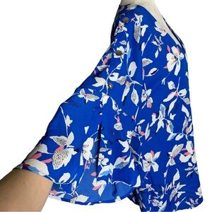 Add a pop of color to your wardrobe with this Prescott New York women’s tunic blouse in a vibrant cobalt blue floral print. Featuring a flowy silhouette, V-neckline, and bell sleeves with decorative button details down the arms, this piece offers a flattering and breezy fit for both work and casual wear.