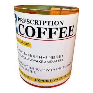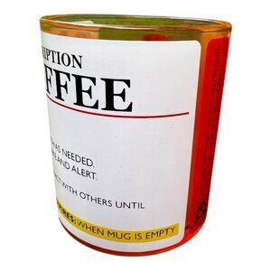 Wake up and laugh as you prescribe yourself a dose of caffeine with this hilarious coffee mug. Its vibrant orange glass and quirky warning labels ensure your coffee addiction is both functional and amusing. A humor-filled gift for any caffeine lover. • Made of durable orange glass • 17.5 oz capacity • Features funny prescription-themed design • Warning labels add humor and charm • Easy-grip handle for comfort Condition is excellent with no visible flaws. Top to bottom = 4 inches. Diameter = 3.5 inches.