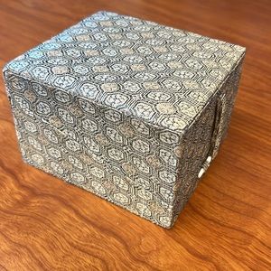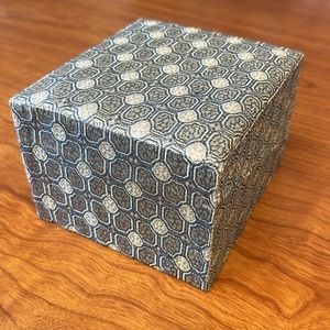Lovely presentation gift box. Silk like material on outside, no imperfections. Red velvet like material inside. 4”W x 4”D x 3”H