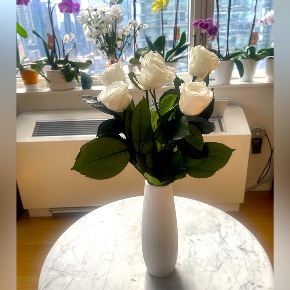 6 White Long-Stem Eternity Roses in ceramic Vase.