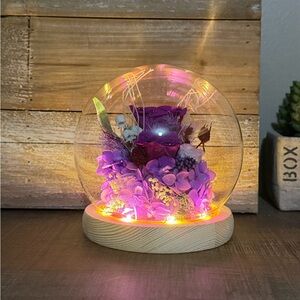 Illuminate your space with this elegant preserved roses gift. Featuring vibrant purple and pink hues, this piece adds a touch of sophistication to any room. Perfect for special occasions.