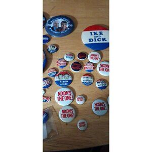 This lot features a massive group of vintage President Campaign Pin Buttons, dating back to the 1900s. The collection includes buttons with various designs and slogans, such as "Nixon's the One" and "Kennedy for President". These buttons were produced in the United States and are made of metal material.