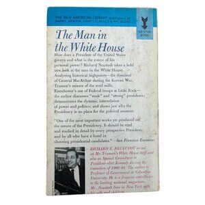 1964 paperback copy of Presidential Power by Richard E. Neustadt. "How does a President of the United States govern and what is the extent of his personal power? Richard Neustadt takes a bold new look at the man in the White House. Analyzing historical highpoints - the dismissal of General MacArthur during the Korean war, Turman's seizures of the steel mills, Eisenhower's use of Federal troops at Little Rock - the author discusses "weak" and "strong" presidents; demonstrates the dynamic interrelation of power and politics; and shows just why the Presidency is not place for the political amateur."