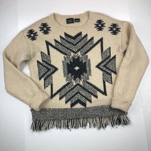 Press Cream & Black Aztec Wool Blend Crew Neck Fringed Sweater. Excellent pre-owned condition, no flaws or stains.