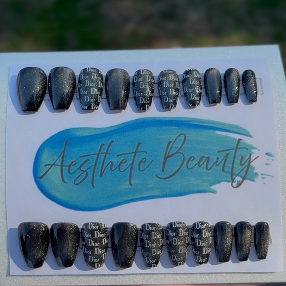 Cat Eye black press-on nails with fine shimmer. Accent nails feature repeated Dior logo. Easy to apply and instantly polished. Chic designer-inspired look.