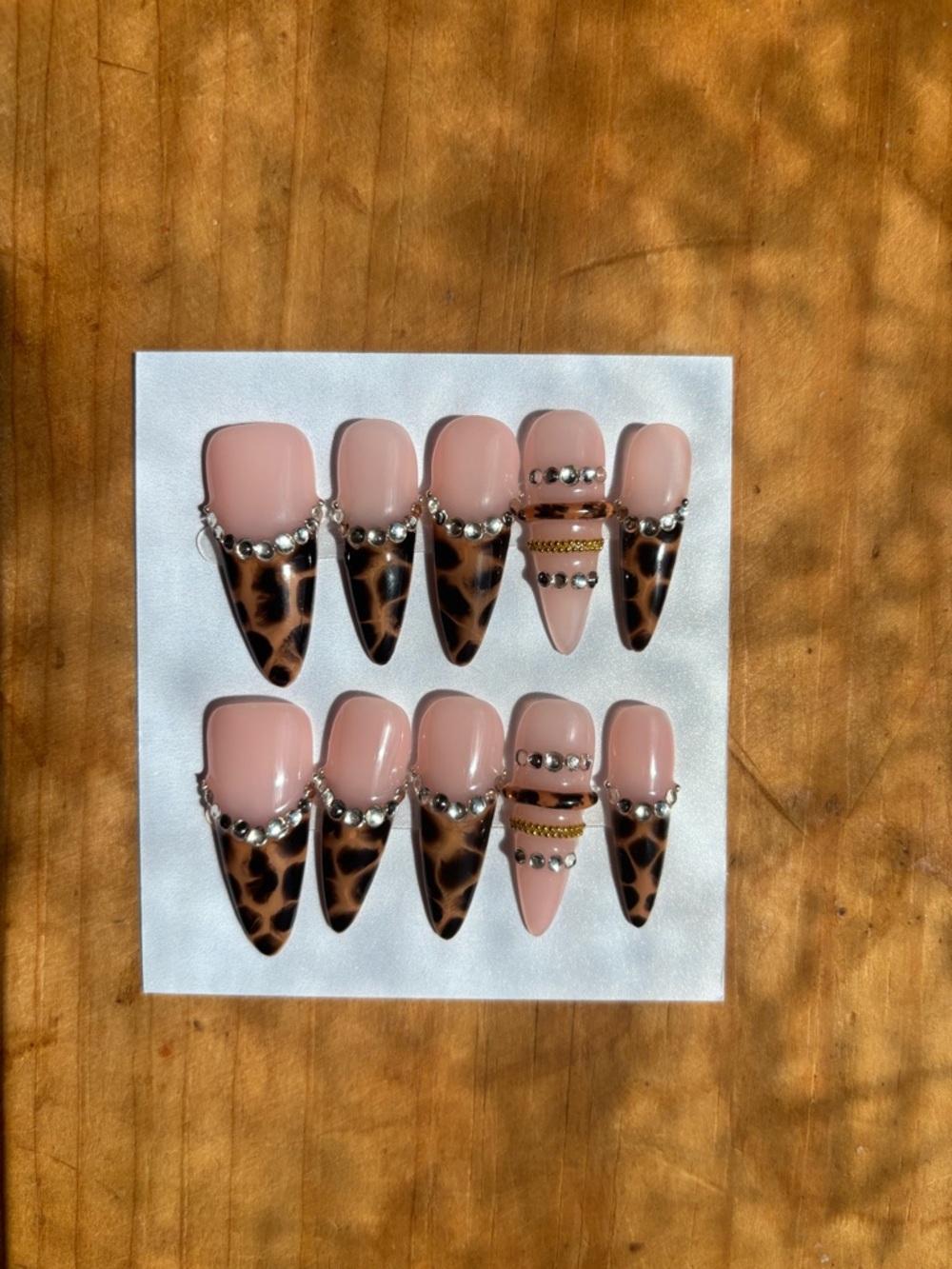 Elegant nude pink press-on nail set with bold leopard-tip design. Features sparkling rhinestone and gold strip accents for a luxe finish. Easy to apply and reusable for instant salon-ready style. Includes nude pink and leopard patterns for a fashionable look.
