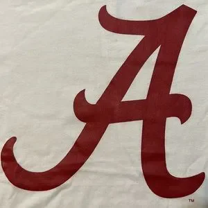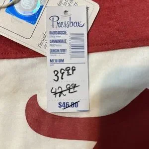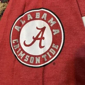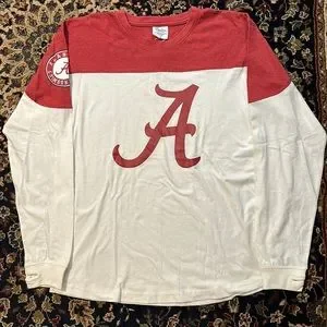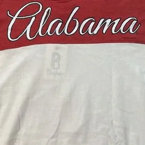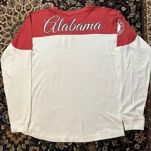 Women’s Alabama t-shirt. Red and cream colored with thumb holes at bottom of sleeves. The size is Medium but this is a big t-shirt, more like a large. NWT